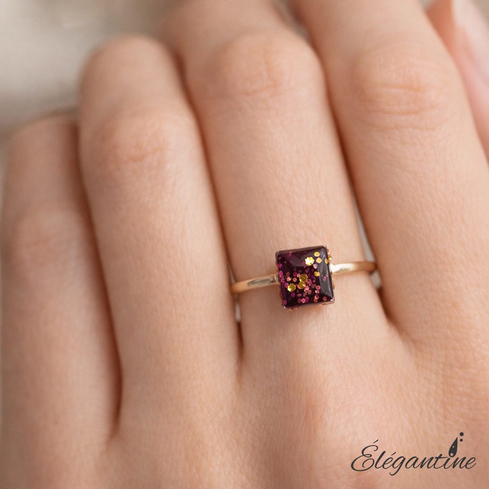 Sa forme carrée, aux lignes modernes et affirmées, renferme une résine aux teintes profondes, presque mystérieuses. À l’intérieur, des éclats dorés et cuivrés viennent capter la lumière, créant un contraste saisissant entre ombre et éclat.