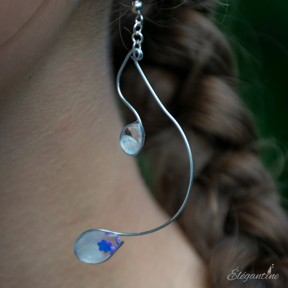 Boucles d'oreilles de la collection Larmes du soleil blanches avec intégration d'une étoile bleutée. Fabrication artisanale française en résine UV avec cadre en fil de fer couleur argent.