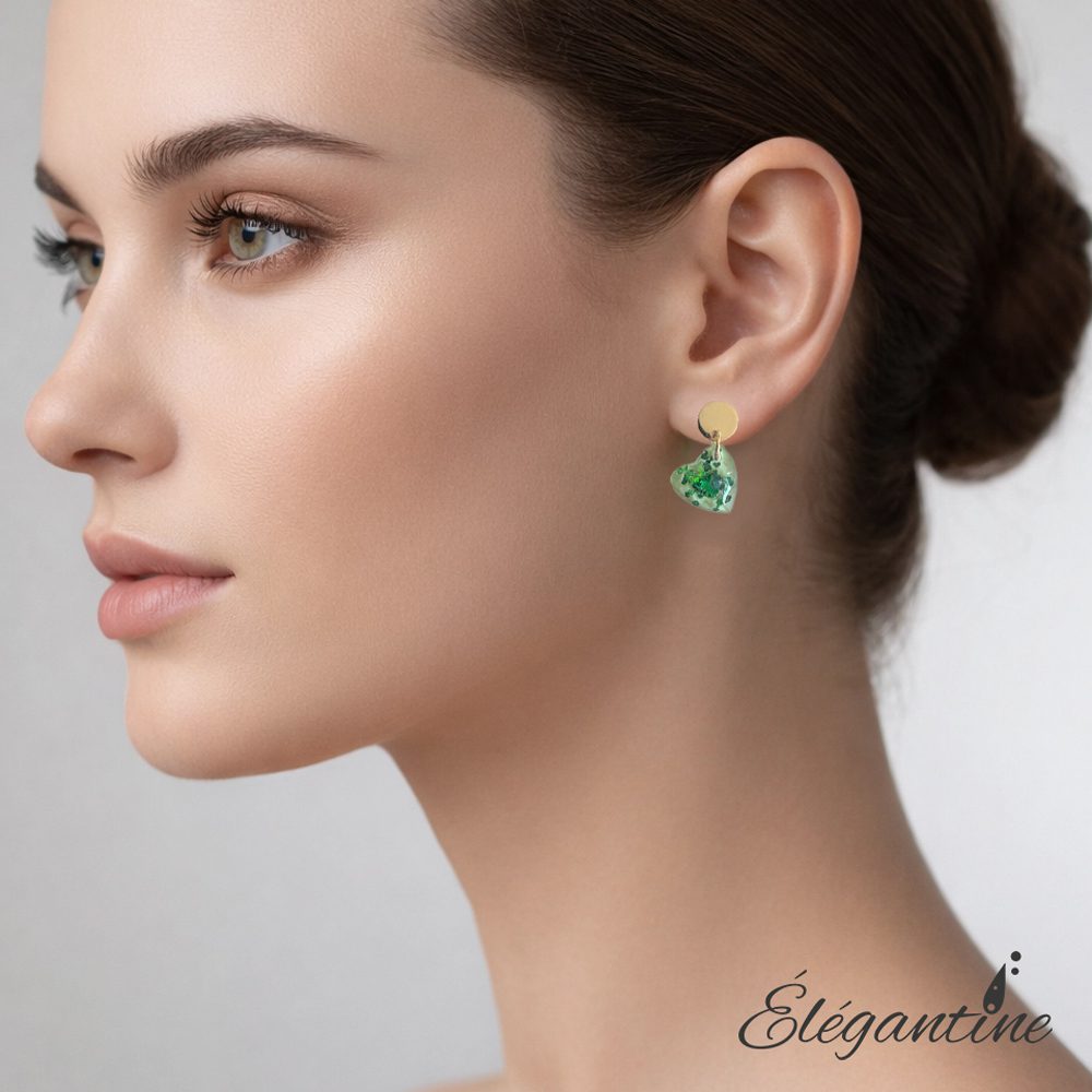Leur forme en cœur, symbole universel d’amour et de douceur, s’inscrit dans un design épuré et féminin. La résine laisse apparaître de fines paillettes vertes qui captent la lumière avec subtilité, apportant éclat et légèreté à la création.