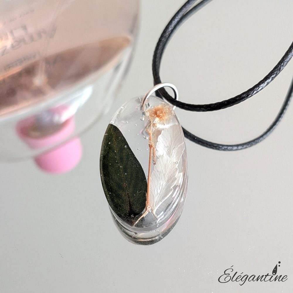 Ce pendentif ovale en résine cristalline capture avec finesse un fragment de nature : une feuille verte et une fleur séchée délicatement emprisonnées pour toujours. Chaque détail est mis en valeur par la transparence de la résine, comme une petite bulle de poésie.